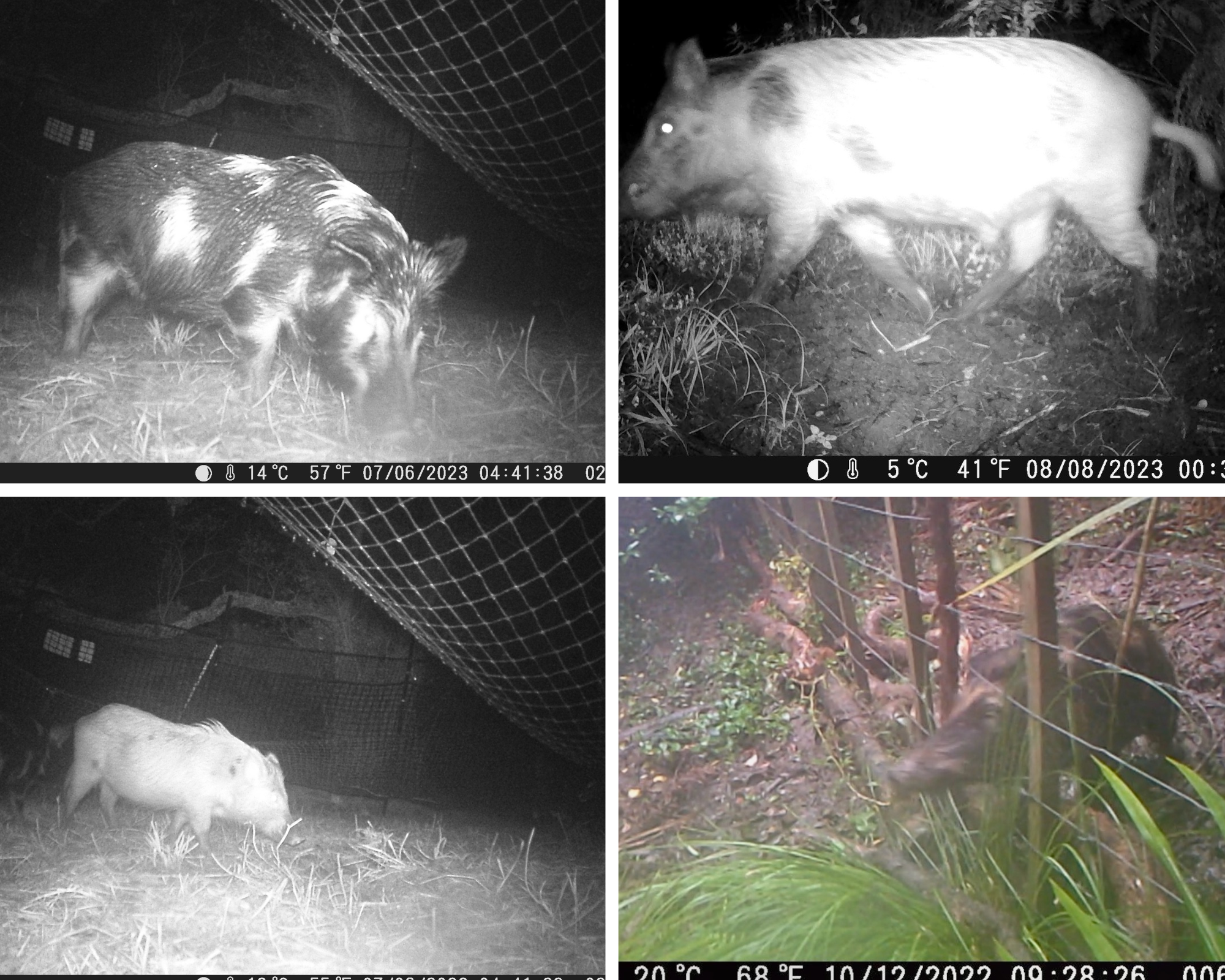 Where might a trail camera be useful? A camera or two near a trap or bait station will enhance your understanding of your quarry enormously. You may well be surprised and annoyed to find your target animal visiting but ignoring the trap filled with your most delicious and irresistible bait. Possibly even dancing gleefully on the top of your trap! Or, you might find a video of a pāteke family with 6 chicks in tow, far from the nearest waterway. Ten months later, presumably the same family shows up again at the same spot - grown up, but missing a few siblings. Our monitoring of the pig trap (an essential part of the exercise) has captured some stunning images of visiting kahu, scooping up bits of rabbit. Perhaps (like me) you’ll be horrified to see how many cats (including the neighbours’) wander by. Pigs, pigs, and more pigs! Proof of the ineffectiveness of a five wire fence to contain a pig!