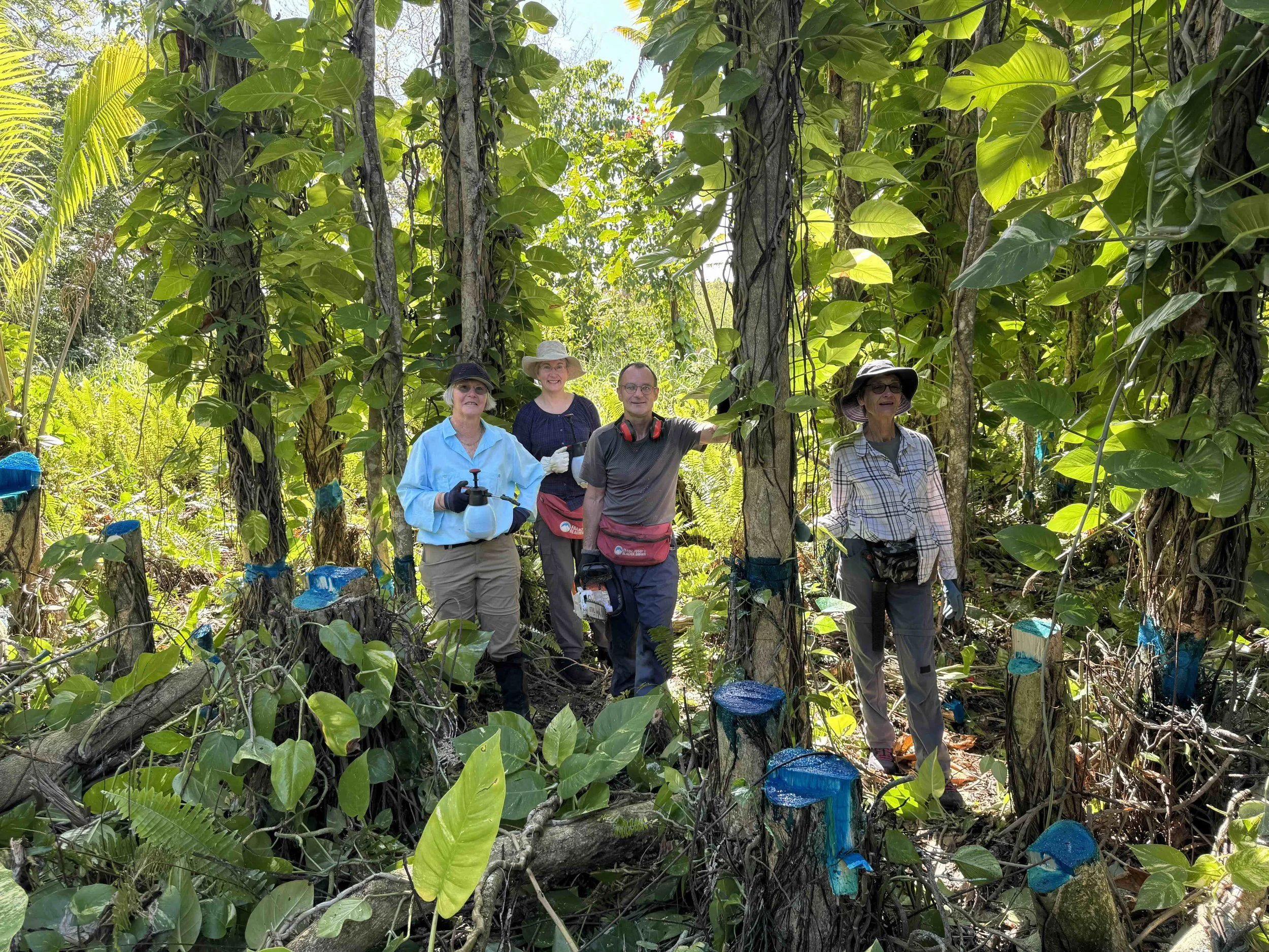 On the third day (Friday) we worked at a site on the side of the road opposite the island Plant Research Station. This was very challenging, with some big African Tulip trees along with Taro vine and other invasives. After morning tea Huggard showed us around the Research Station where they propagate several agriculturally important crops for the island including vanilla, coffee, banana, and coconut. According to Huggard this was one of the original sites from which African Tulip tree spread, as one of the early roles of the station was to propagate exotic species as ornamentals for island gardens. Huggard and his father had both previously worked at the Research Station but its staffing levels are now very low compared to what they were when he and his father worked there. Consequently, many invasives, including Taro Vine and African Tulip Tree, have got away within the boundaries of the station. While removing the African Tulip Trees at this site we noticed that two big trees that had been previously been felled were regenerating, highlighting to everyone that we had to be very thorough in treating all cut ends with herbicide spray or paste. While accessing the trees here was much easier than the ‘jungle’ area across the road there were more plants than originally anticipated, so we agreed to return the following Tuesday to finish this site and to clear the trees at the third major site near Liku village.