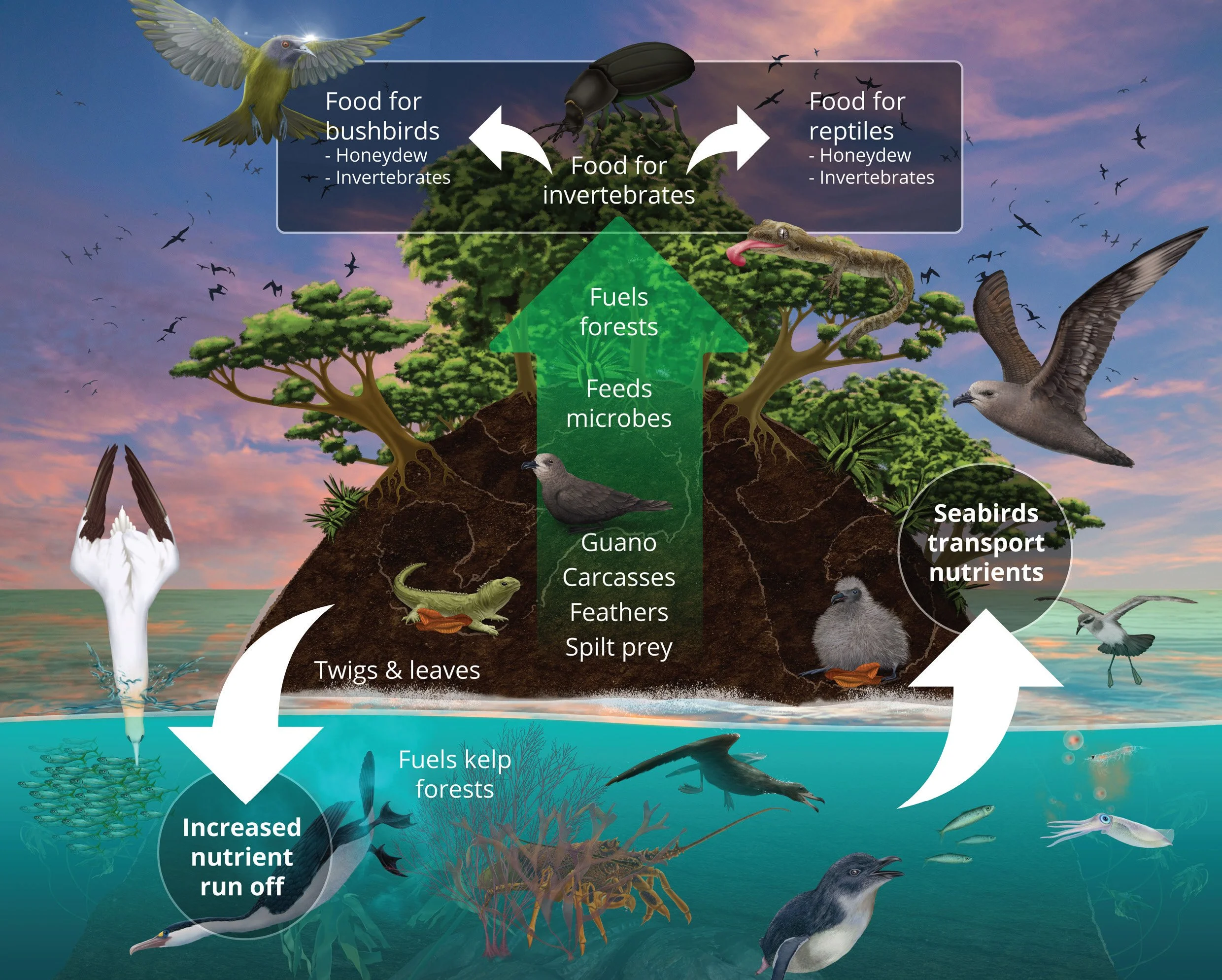 With the return of seabirds, connections between land and sea would slowly be repaired. We know how important seabird nutrients are to our soils and forests but recently we have learnt that these nutrients, on finding their way back to the marine environment, enrich the surrounding reefs and fisheries. We already have an outstanding marine environment around Aotea, but it could be even better if our seabirds were to return.