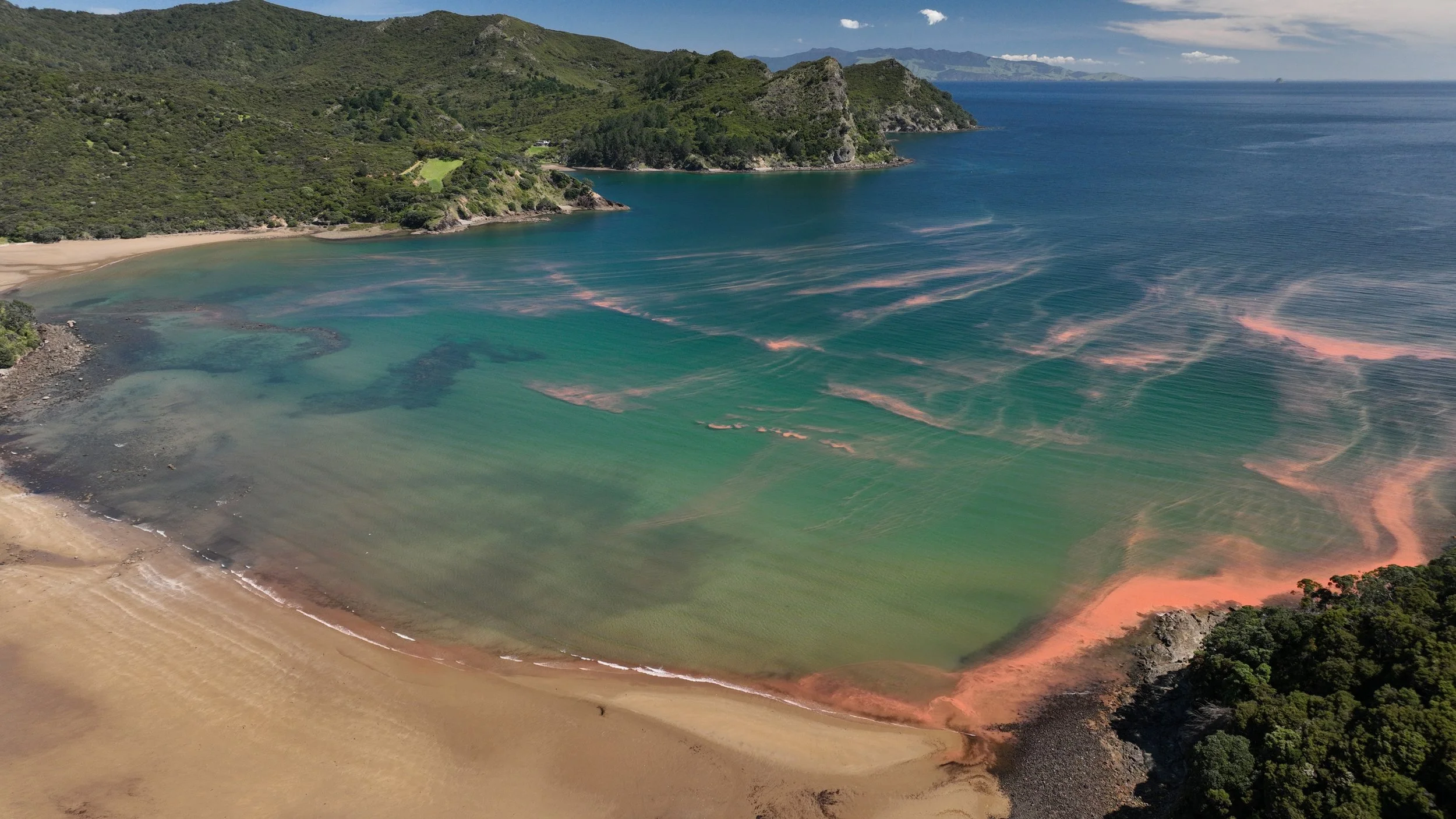 Drone images of Noctiluca in Okupe Harbour on 24 November 2025 (Credit: Manta Watch New Zealand)